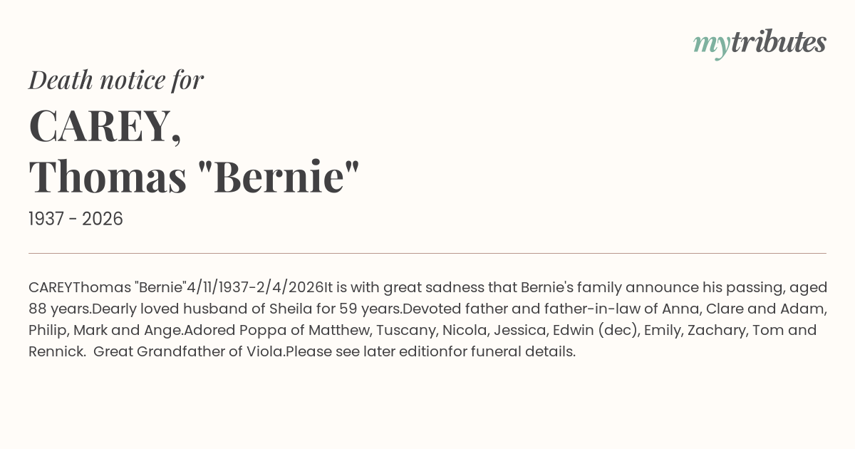 Adored Poppa of Matthew, Tuscany, Nicola, Jessica, Edwin (dec), Emily, Zachary, Tom and Rennick. Great Grandfather of Viola.