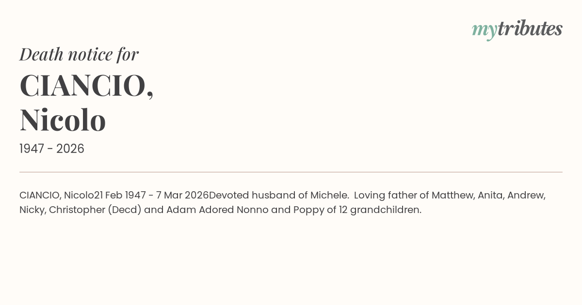 Loving father of Matthew, Anita, Andrew, Nicky, Christopher (Dec’d) and Adam