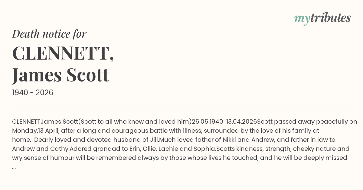 Scott passed away peacefully on Monday,13 April, after a long and courageous battle with illness, surrounded by the love of his family at home. Dearly loved and devoted husband of Jill.