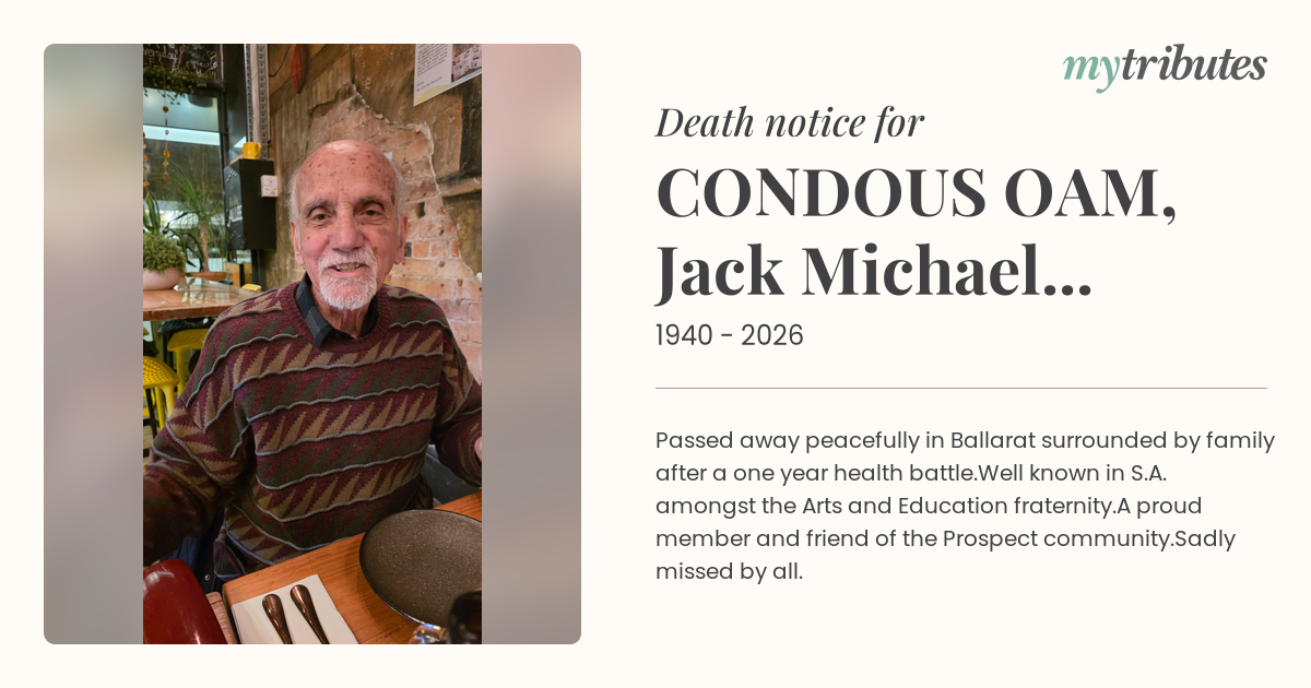 18°CPassed away peacefully in Ballarat surrounded by family after a one year health battle.Well known in S.A. amongst the Arts and Education fraternity.A proud member and friend of the Prospect community.