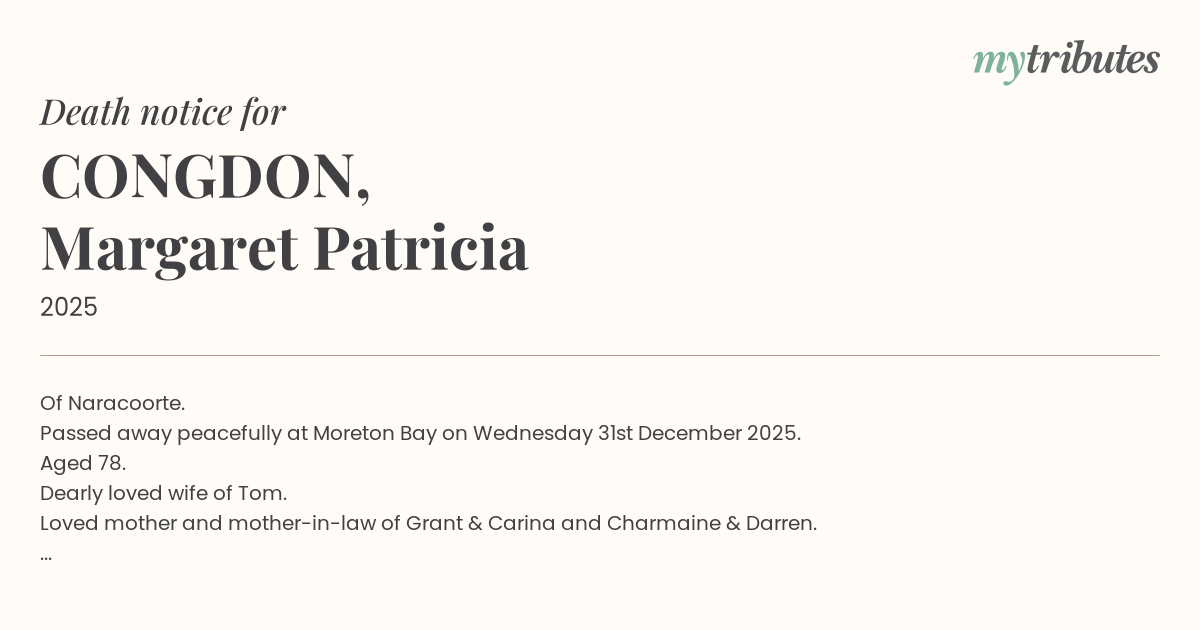 Passed away peacefully at Moreton Bay on Wednesday 31st December 2025.