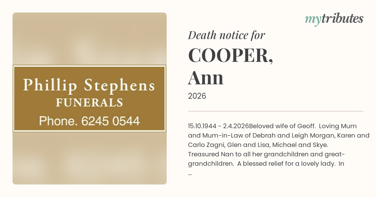 Beloved wife of Geoff. Loving Mum and Mum-in-Law of Debrah and Leigh Morgan, Karen and Carlo Zagni, Glen and Lisa, Michael and Skye. Treasured Nan to all her grandchildren and great-grandchildren. A blessed relief for a lovely lady. In life we loved you dearly, in death we love you still. In our hearts you hold a place no one will ever fill. No more pain. Now at rest. Private Cremation