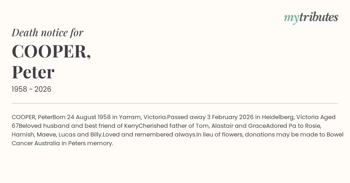 Passed away 3 February 2026 in Heidelberg, Victoria Aged 67