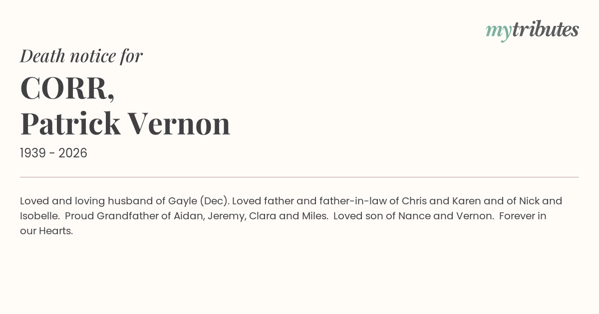 18°CLoved and loving husband of Gayle (Dec). Loved father and father-in-law of Chris and Karen and of Nick and Isobelle. Proud Grandfather of Aidan, Jeremy, Clara and Miles. Loved son of Nance and Vernon.