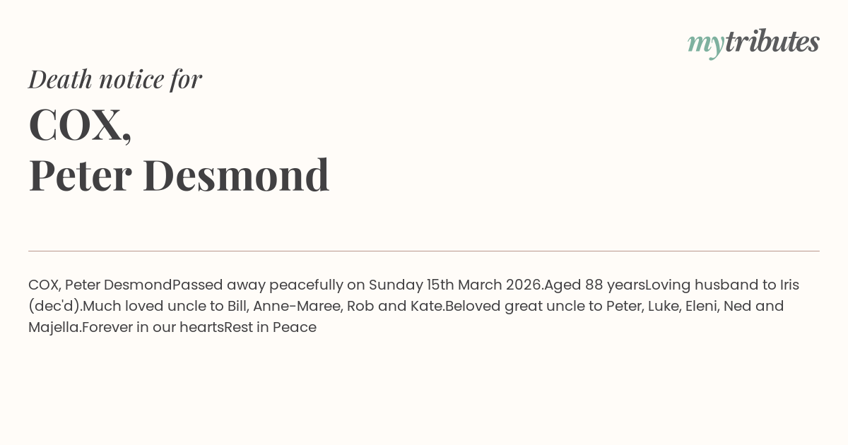 Beloved great uncle to Peter, Luke, Eleni, Ned and Majella.
