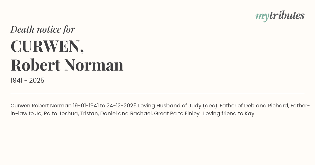 18°CCurwen Robert Norman 19-01-1941 to 24-12-2025 Loving Husband of Judy (dec). Father of Deb and Richard, Father-in-law to Jo, Pa to Joshua, Tristan, Daniel and Rachael, Great Pa to Finley. Loving friend to Kay.