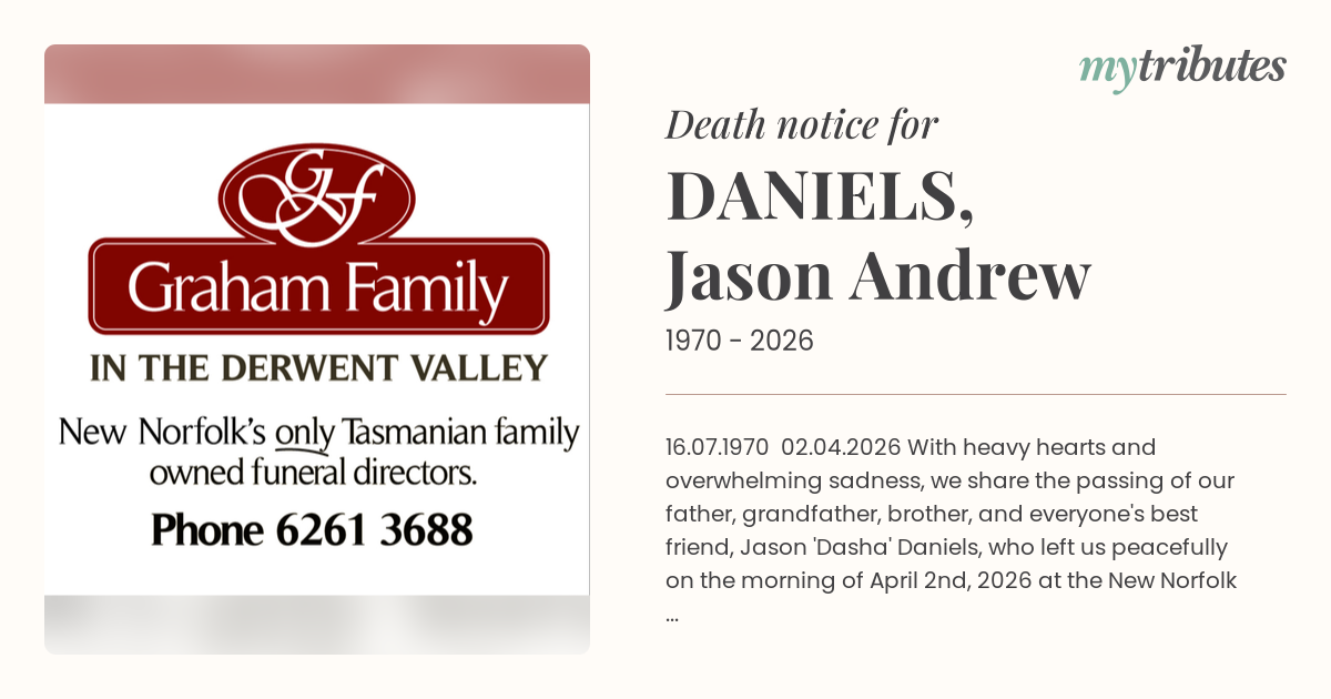 18°C16.07.1970 – 02.04.2026 With heavy hearts and overwhelming sadness, we share the passing of our father, grandfather, brother, and everyone's best friend, Jason 'Dasha' Daniels, who left us peacefully on the morning of April 2nd, 2026 at the New Norfolk District Hospital. Jason was the most compassionate, endearing, hilarious, loving, hard-working, loyal, and selfless person we have ever known. The impact he made on all of our lives is immeasurable, and he will be forever missed. Beloved son of Mary Frances and Herbert John 'Jack' Daniels (both dec). Loving father to Kyle and Jaidyn, stepfather to Aaron. Adored father-in-law to Jacqueline and 'Poppy' of Adeline. Dear brother to Elaine, John, David and Paul. Rest peacefully, Jason. We love you always. Sweet dreams.