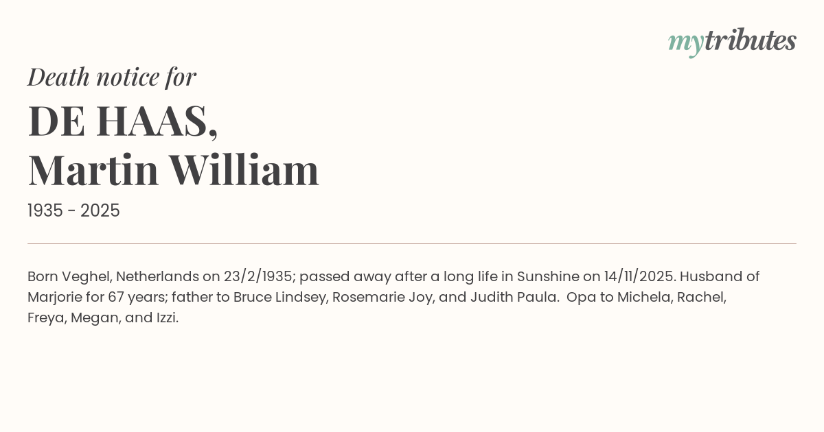 18°CBorn Veghel, Netherlands on 23/2/1935; passed away after a long life in Sunshine on 14/11/2025. Husband of Marjorie for 67 years; father to Bruce Lindsey, Rosemarie Joy, and Judith Paula. Opa to Michela, Rachel, Freya, Megan, and Izzi.