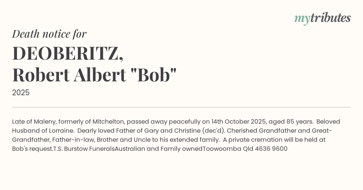 18°CLate of Maleny, formerly of Mitchelton, passed away peacefully on 14th October 2025, aged 85 years.