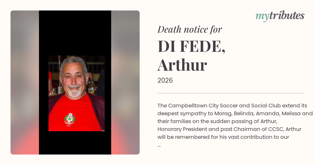 18°CThe Campbelltown City Soccer and Social Club extend its deepest sympathy to Morag, Belinda, Amanda, Melissa and their families on the sudden passing of Arthur, Honorary President and past Chairman of CCSC, Arthur will be remembered for his vast contribution to our Club and the Football family in general.