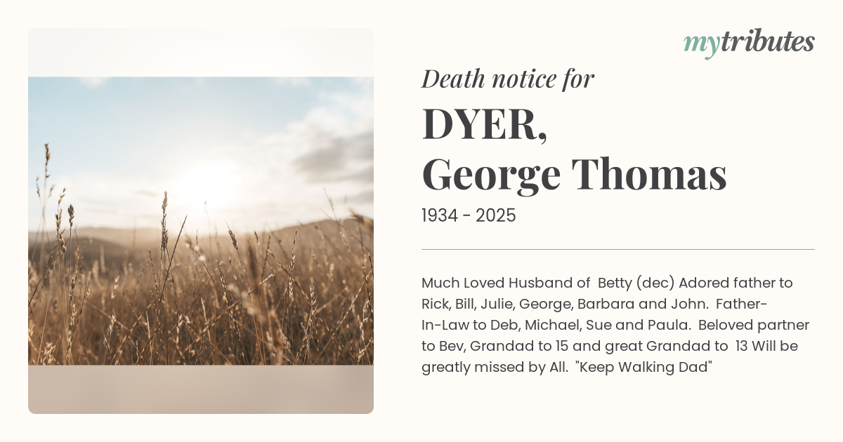 18°CMuch Loved Husband of Betty (dec) Adored father to Rick, Bill, Julie, George, Barbara and John. Father-In-Law to Deb, Michael, Sue and Paula. Beloved partner to Bev, Grandad to 15 and great Grandad to 13