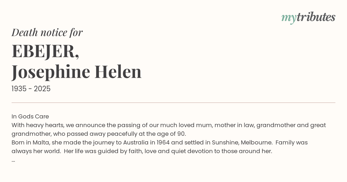 Born in Malta, she made the journey to Australia in 1964 and settled in Sunshine, Melbourne. Family was always her world. Her life was guided by faith, love and quiet devotion to those around her.