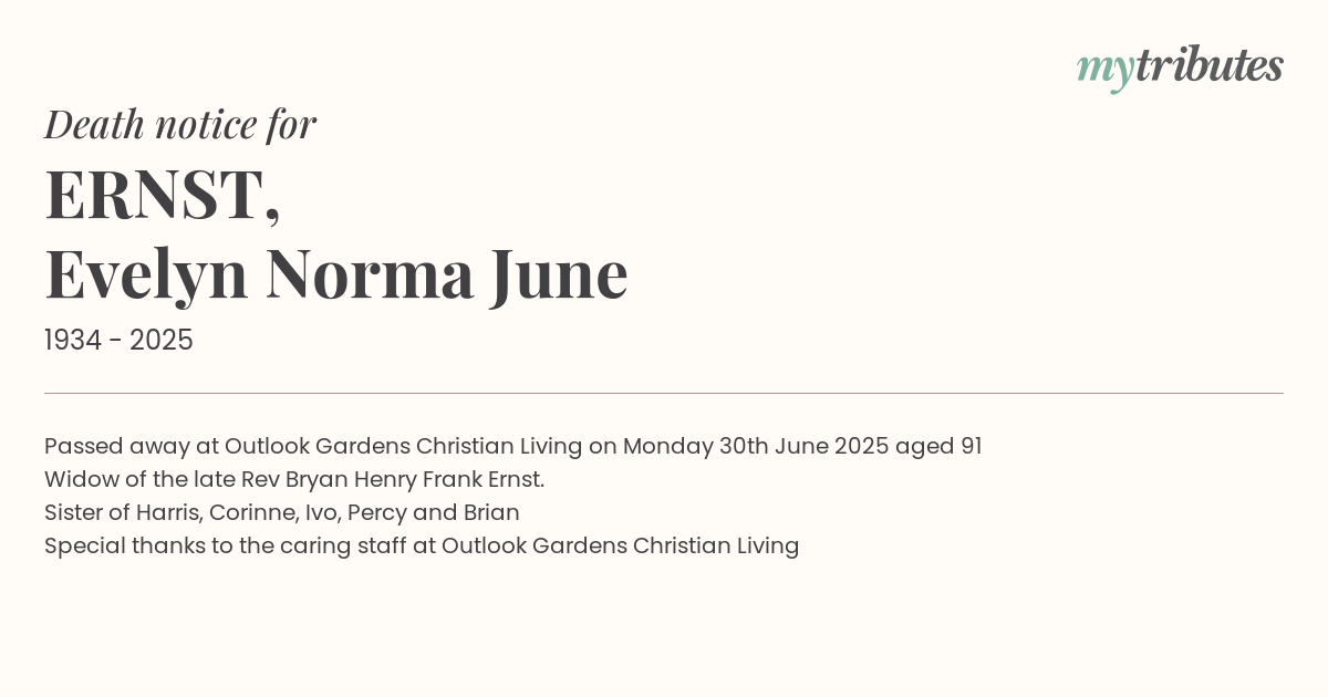 18°CPassed away at Outlook Gardens Christian Living on Monday 30th June 2025 aged 91