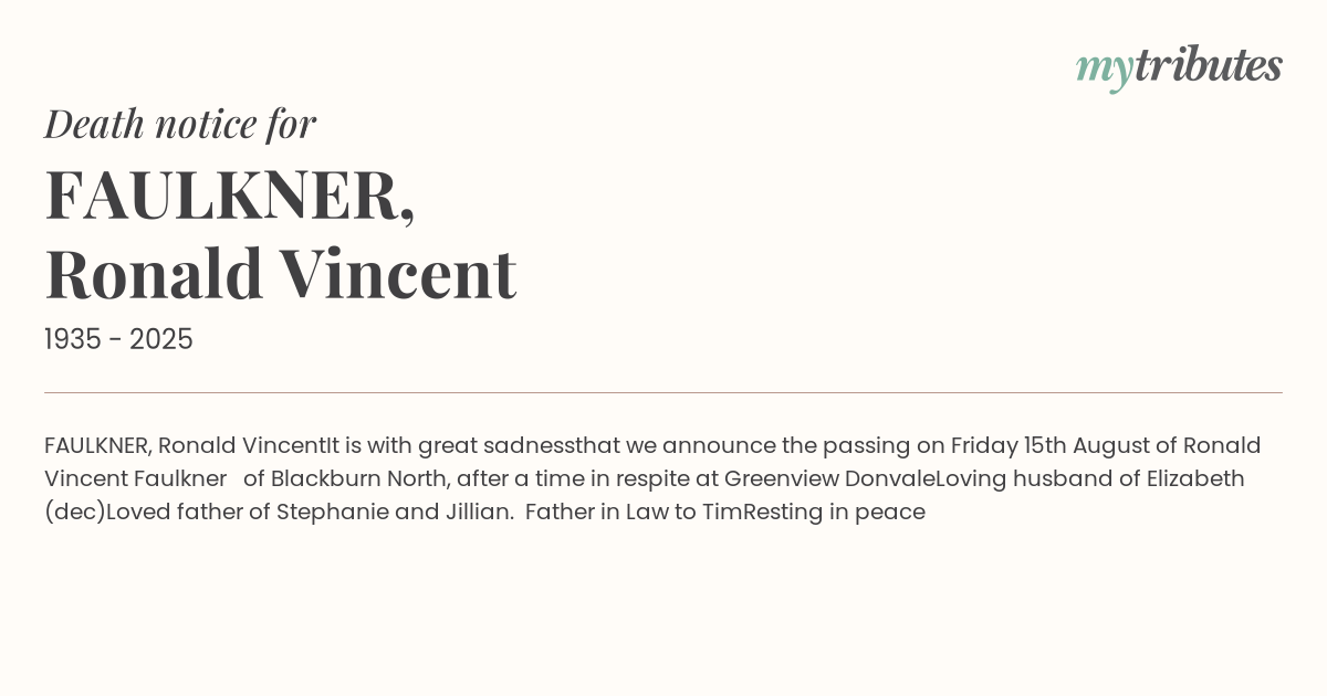 Ronald Vincent Faulkner of Blackburn North, after a time in respite at Greenview Donvale