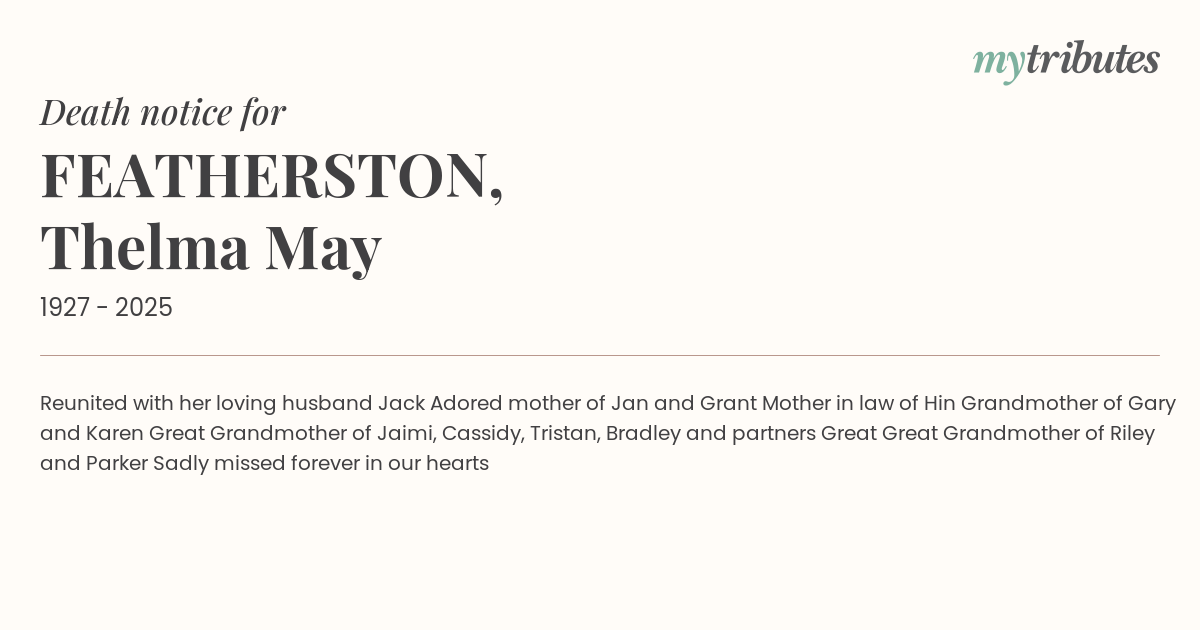 18°CReunited with her loving husband Jack Adored mother of Jan and Grant Mother in law of Hin Grandmother of Gary and Karen Great Grandmother of Jaimi, Cassidy, Tristan, Bradley and partners Great Great Grandmother of Riley and Parker Sadly missed forever in our hearts