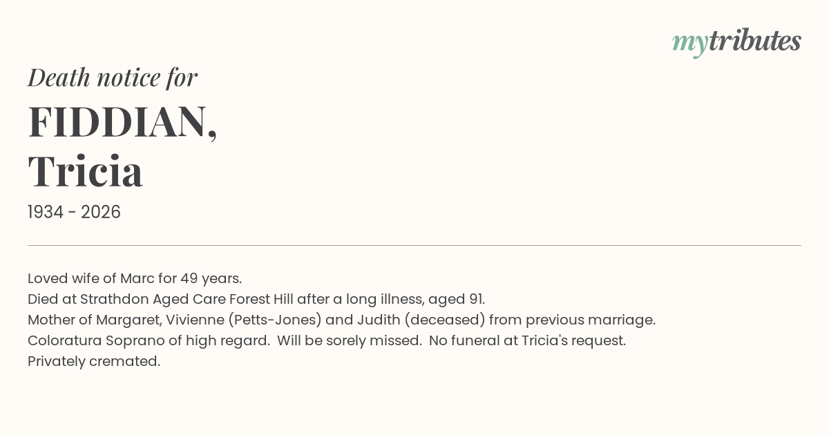 Coloratura Soprano of high regard. Will be sorely missed. No funeral at Tricia's request.