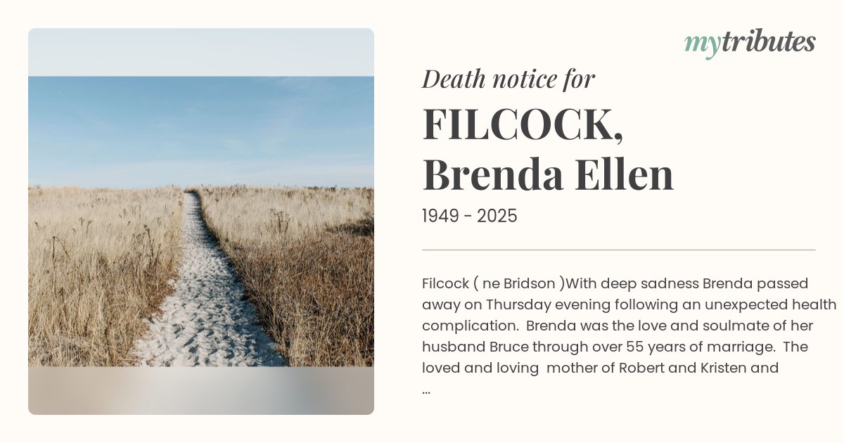 With deep sadness Brenda passed away on Thursday evening following an unexpected health complication. Brenda was the love and soulmate of her husband Bruce through over 55 years of marriage. The loved and loving mother of Robert and Kristen and their spouses Amanda and Hamish. Brenda adored and was adored by her 6 grandchildren, Harry and his wife Sabrina, Connor, Leo, Angus, Callum and Chloe. Brenda was the daughter of Arthur and Joy Bridson, and the sister of Douglas and his wife Satwant,and Colin. We extend our thanks to the wonderful doctors and nurses at the Monash Medical centre, and to Dr Lowther for providing medical care for Brenda over many years.