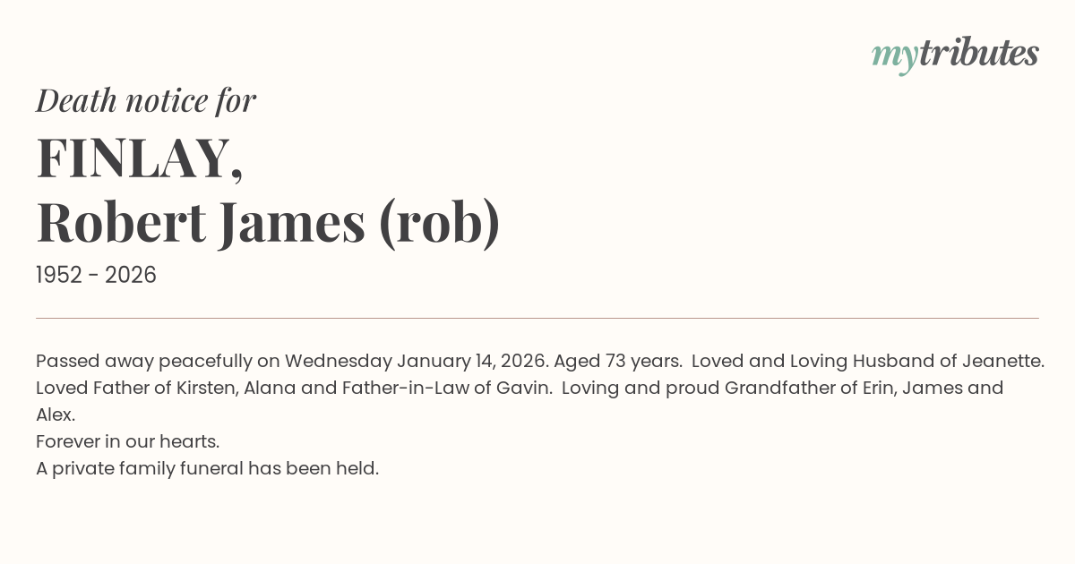 18°CPassed away peacefully on Wednesday January 14, 2026. Aged 73 years. Loved and Loving Husband of Jeanette. Loved Father of Kirsten, Alana and Father-in-Law of Gavin. Loving and proud Grandfather of Erin, James and Alex.