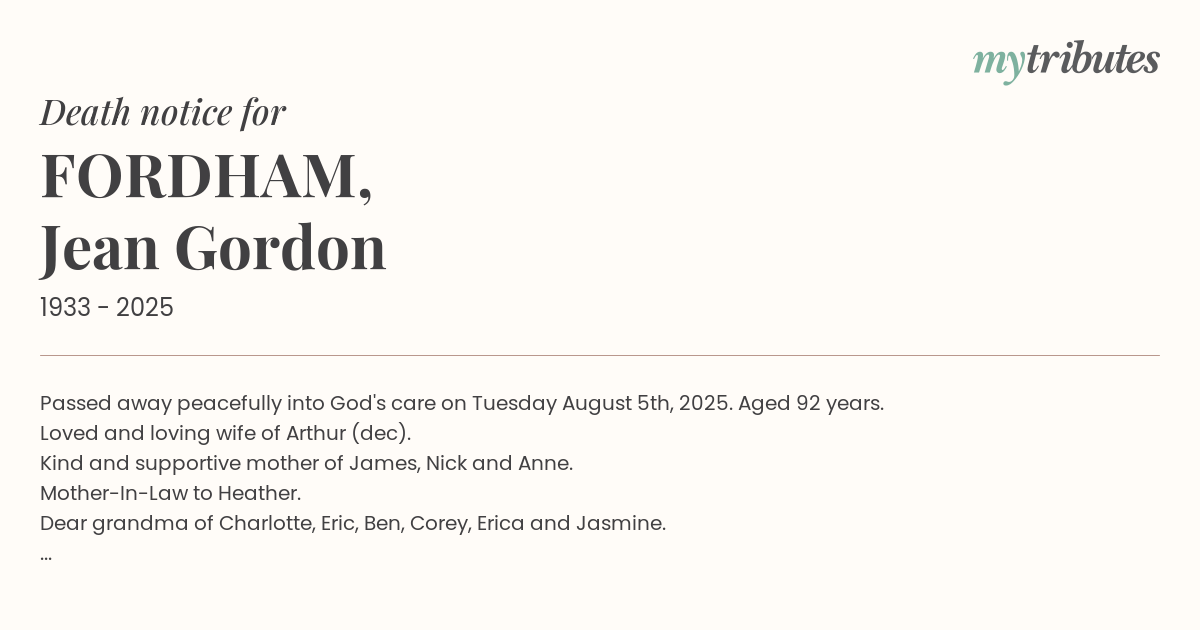 18°CPassed away peacefully into God's care on Tuesday August 5th, 2025. Aged 92 years.