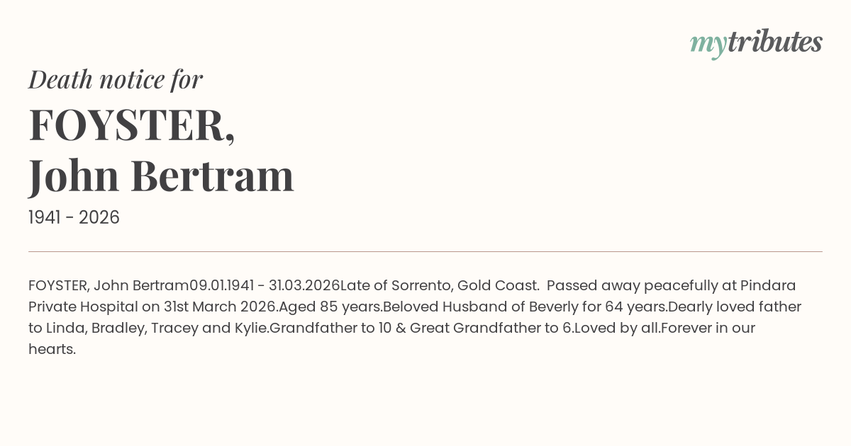 Late of Sorrento, Gold Coast. Passed away peacefully at Pindara Private Hospital on 31st March 2026.