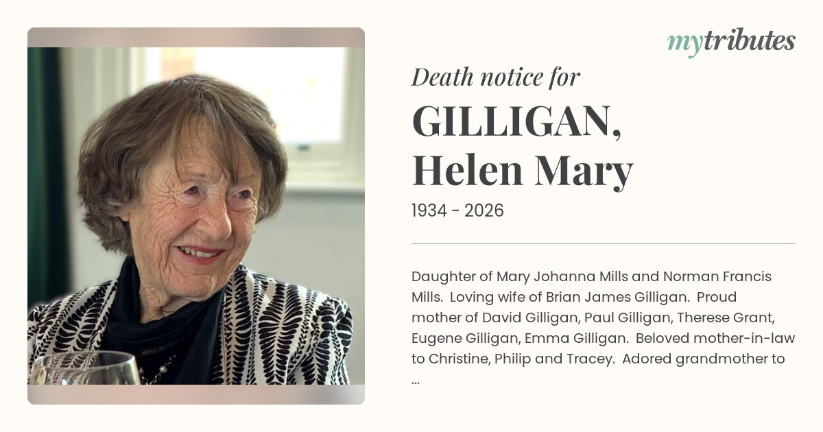 18°CDaughter of Mary Johanna Mills and Norman Francis Mills. Loving wife of Brian James Gilligan. Proud mother of David Gilligan, Paul Gilligan, Therese Grant, Eugene Gilligan, Emma Gilligan. Beloved mother-in-law to Christine, Philip and Tracey. Adored grandmother to Brendan, Emily, Minna, Eilish, Eden, Chloe and Jordan. Great grandmother to Willow, Seren and Bella.
