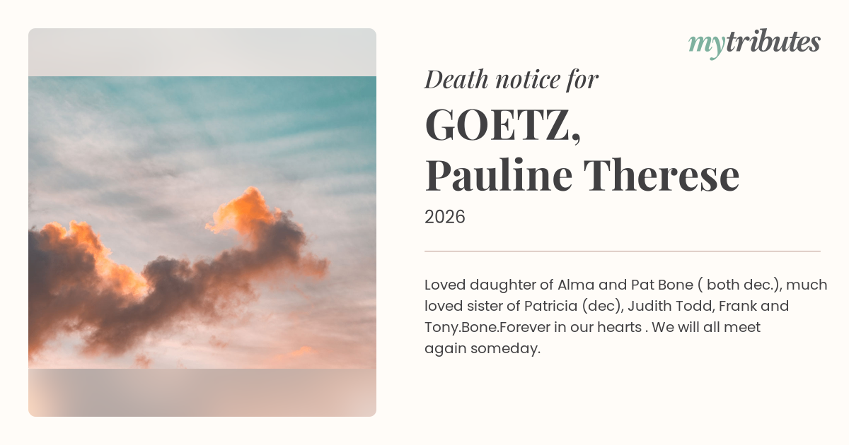 18°CLoved daughter of Alma and Pat Bone ( both dec.), much loved sister of Patricia (dec), Judith Todd, Frank and Tony.Bone.