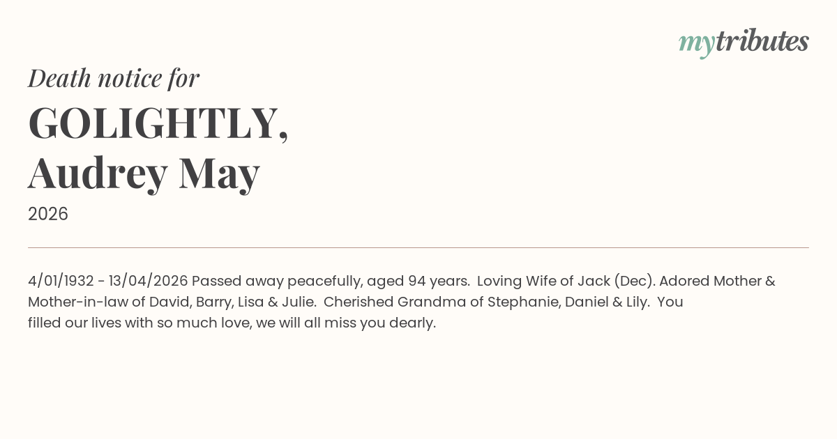 Passed away peacefully, aged 94 years.