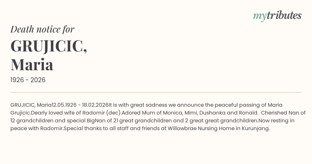 It is with great sadness we announce the peaceful passing of Maria Grujicic.