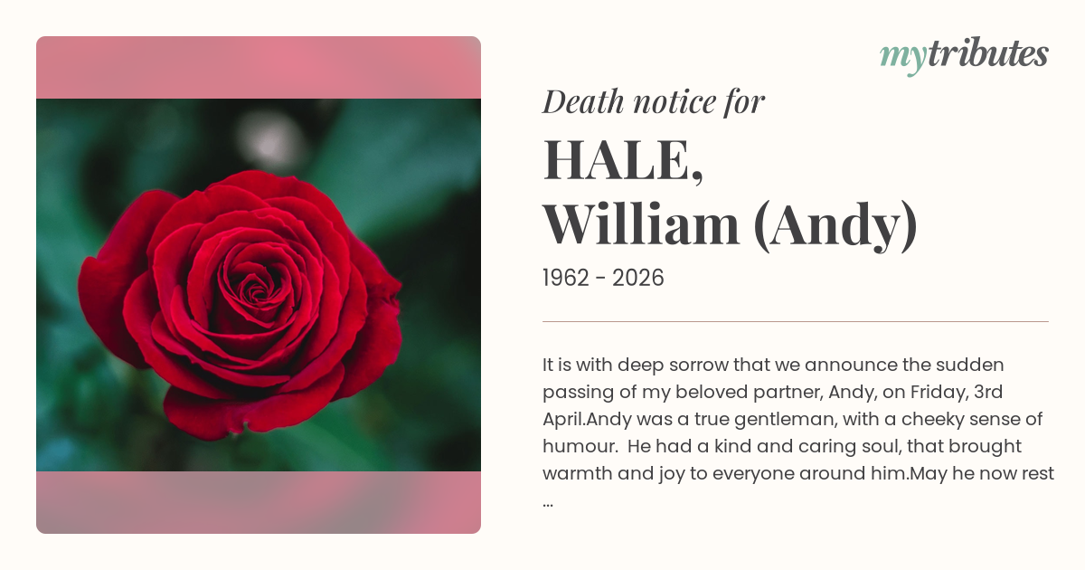 18°CIt is with deep sorrow that we announce the sudden passing of my beloved partner, Andy, on Friday, 3rd April.