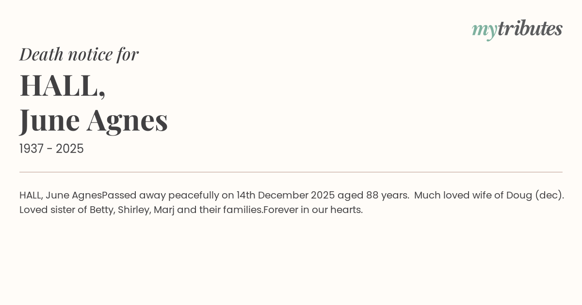 Passed away peacefully on 14th December 2025 aged 88 years. Much loved wife of Doug (dec).