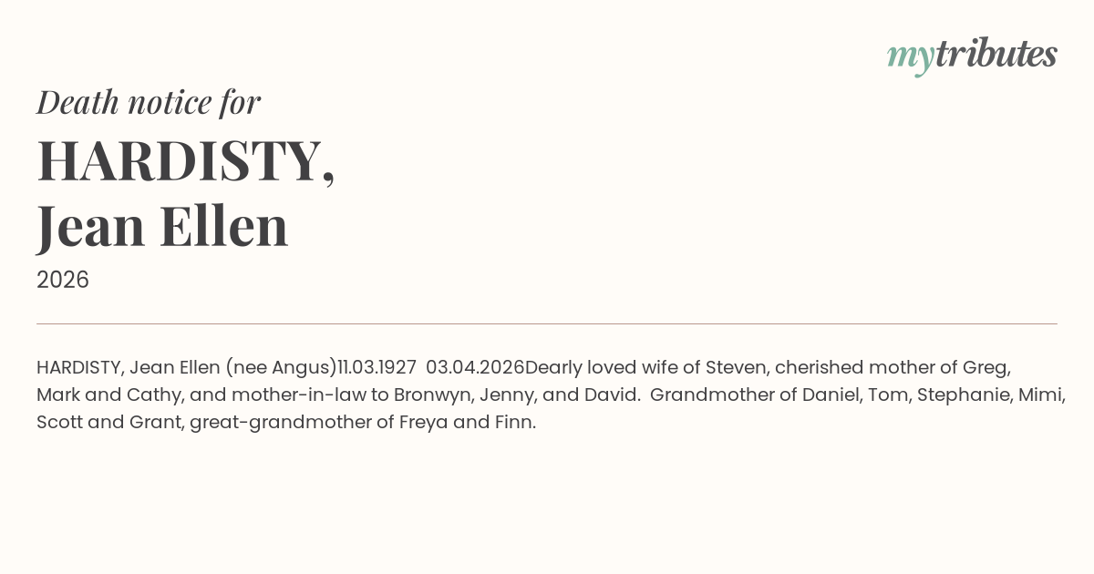 Dearly loved wife of Steven, cherished mother of Greg, Mark and Cathy, and mother-in-law to Bronwyn, Jenny, and David. Grandmother of Daniel, Tom, Stephanie, Mimi, Scott and Grant, great-grandmother of Freya and Finn.