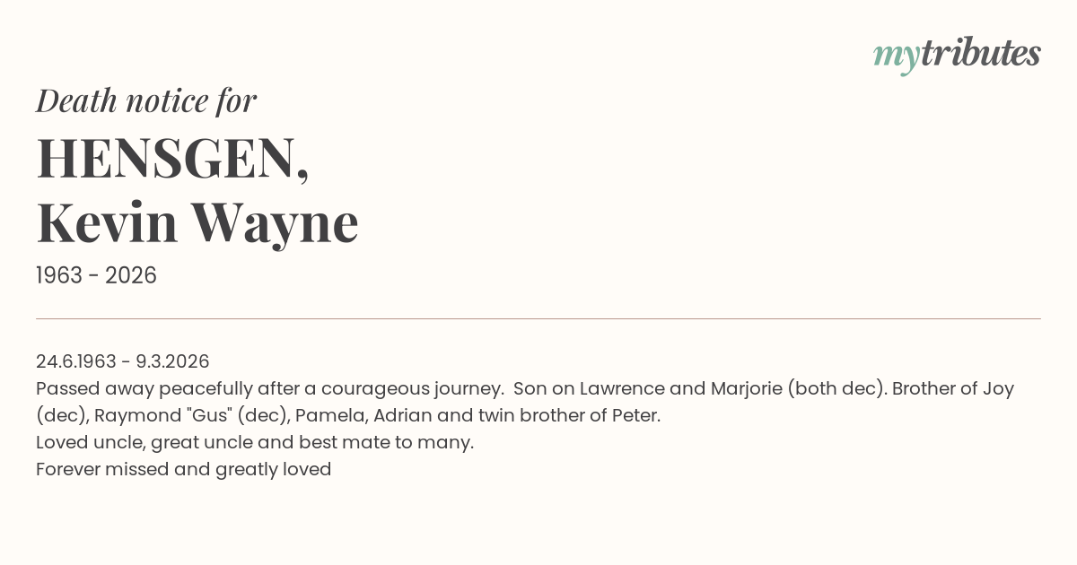 Passed away peacefully after a courageous journey. Son on Lawrence and Marjorie (both dec). Brother of Joy (dec), Raymond "Gus" (dec), Pamela, Adrian and twin brother of Peter.