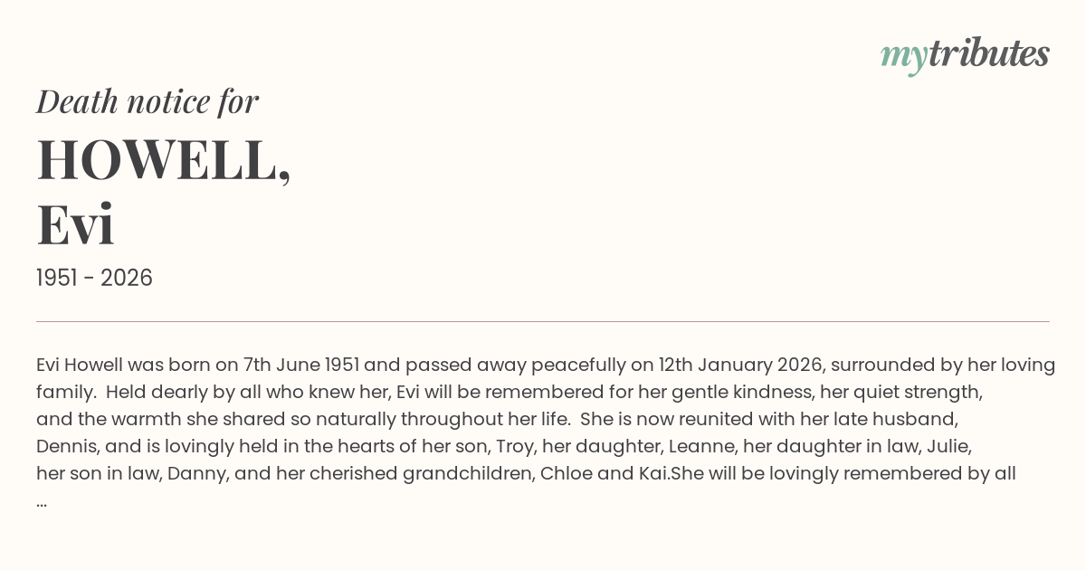 18°CEvi Howell was born on 7th June 1951 and passed away peacefully on 12th January 2026, surrounded by her loving family. Held dearly by all who knew her, Evi will be remembered for her gentle kindness, her quiet strength, and the warmth she shared so naturally throughout her life. She is now reunited with her late husband, Dennis, and is lovingly held in the hearts of her son, Troy, her daughter, Leanne, her daughter in law, Julie, her son in law, Danny, and her cherished grandchildren, Chloe and Kai.