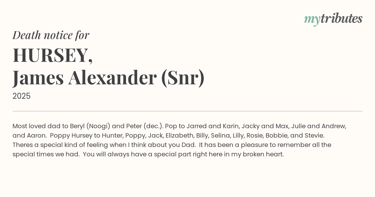 18°CMost loved dad to Beryl (Noogi) and Peter (dec.). Pop to Jarred and Karin, Jacky and Max, Julie and Andrew, and Aaron. Poppy Hursey to Hunter, Poppy, Jack, Elizabeth, Billy, Selina, Lilly, Rosie, Bobbie, and Stevie.