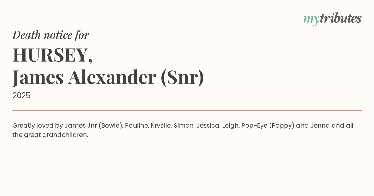 18°CGreatly loved by James Jnr (Bowie), Pauline, Krystle, Simon, Jessica, Leigh, Pop-Eye (Poppy) and Jenna and all the great grandchildren.