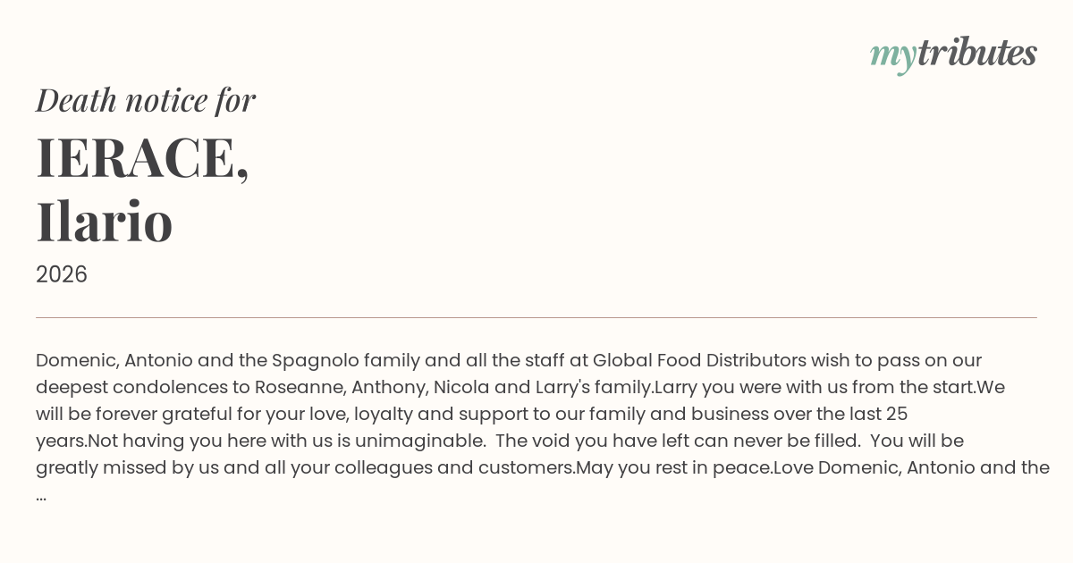 18°CDomenic, Antonio and the Spagnolo family and all the staff at Global Food Distributors wish to pass on our deepest condolences to Roseanne, Anthony, Nicola and Larry's family.