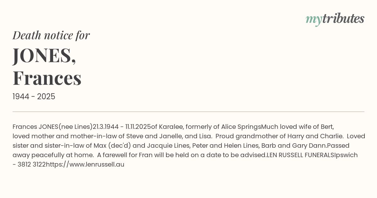 Passed away peacefully at home. A farewell for Fran will be held on a date to be advised.