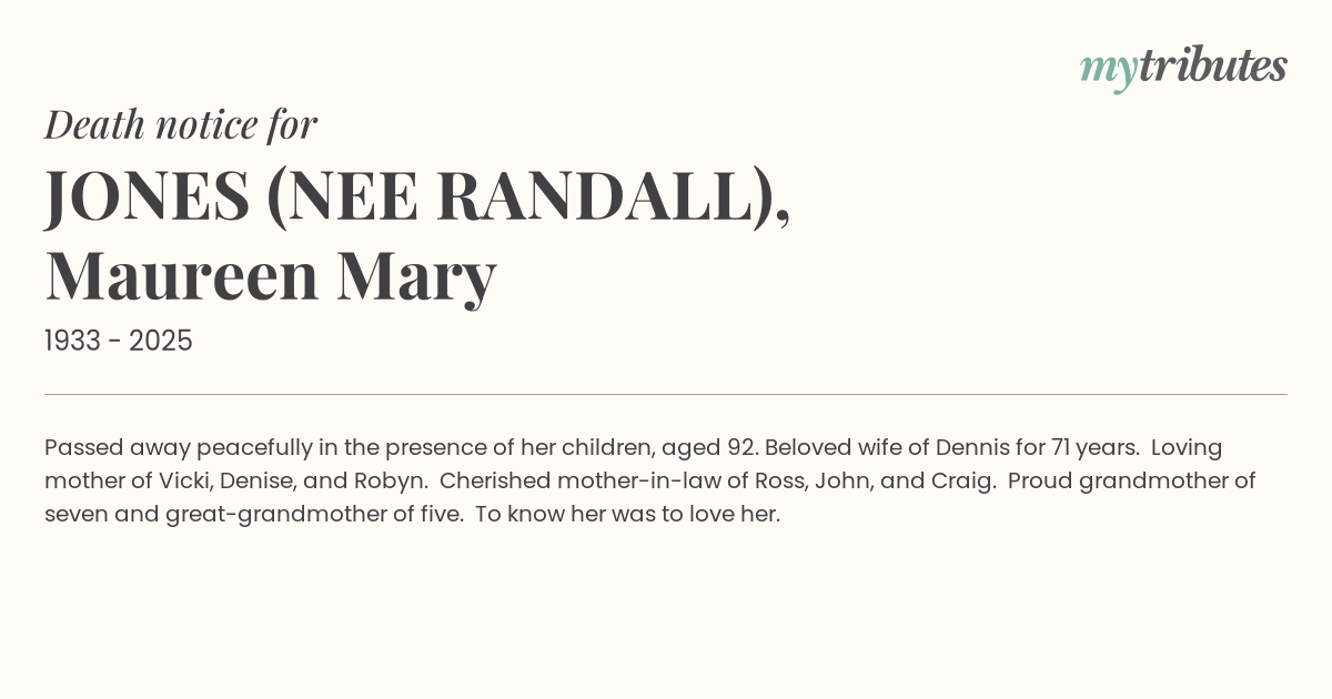 18°CPassed away peacefully in the presence of her children, aged 92. Beloved wife of Dennis for 71 years. Loving mother of Vicki, Denise, and Robyn. Cherished mother-in-law of Ross, John, and Craig. Proud grandmother of seven and great-grandmother of five. To know her was to love her.