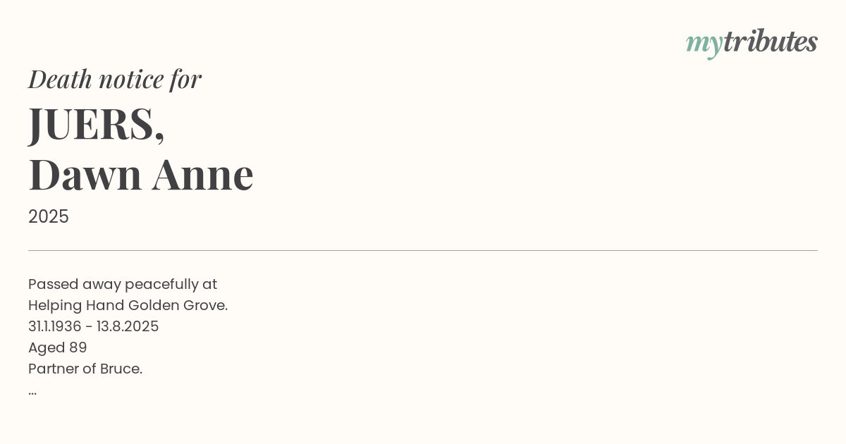 18°CPassed away peacefully at Helping Hand Golden Grove. 31.1.1936 - 13.8.2025 Aged 89 Partner of Bruce. Dearly loved mother of Peter, Kaylene and Glenn. Adored mother-in-law of Jodie, Duncan and Anne. Cherished grandmother of Ryan, Ben, Kate, Iain & Kristie, Nicole & Lauren. Great grandmother of Mason, Maeve and Emmett. A gentle soul now at peace.