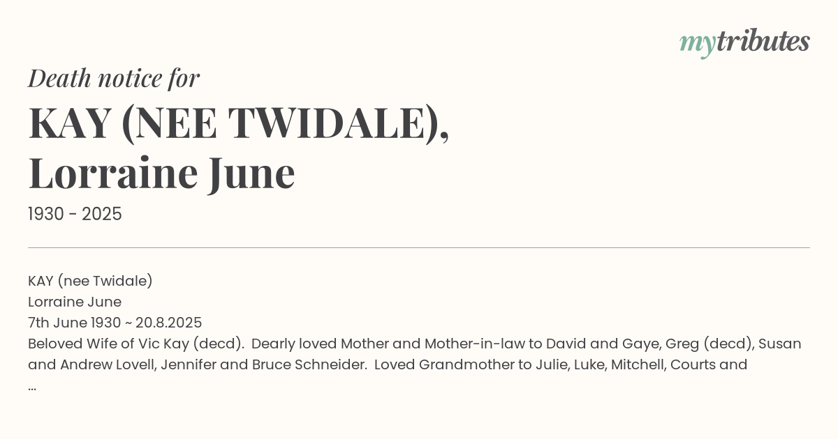 Beloved Wife of Vic Kay (decd). Dearly loved Mother and Mother-in-law to David and Gaye, Greg (decd), Susan and Andrew Lovell, Jennifer and Bruce Schneider. Loved Grandmother to Julie, Luke, Mitchell, Courts and Great-Grandmother to their families. Much loved Sister, Sister-in-law and Aunt to Lois, Glenice (decd) and their families.