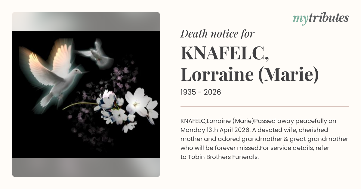 Passed away peacefully on Monday 13th April 2026. A devoted wife, cherished mother and adored grandmother & great grandmother who will be forever missed.