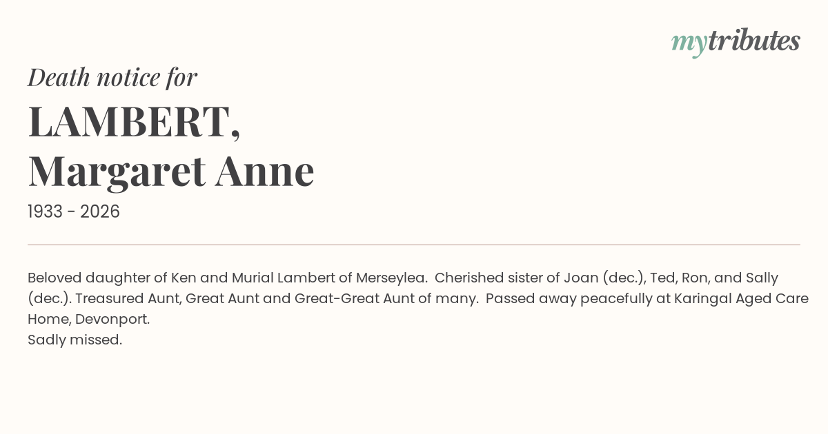 18°CBeloved daughter of Ken and Murial Lambert of Merseylea. Cherished sister of Joan (dec.), Ted, Ron, and Sally (dec.). Treasured Aunt, Great Aunt and Great-Great Aunt of many. Passed away peacefully at Karingal Aged Care Home, Devonport.