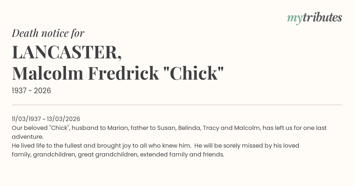 Our beloved "Chick", husband to Marian, father to Susan, Belinda, Tracy and Malcolm, has left us for one last adventure.
