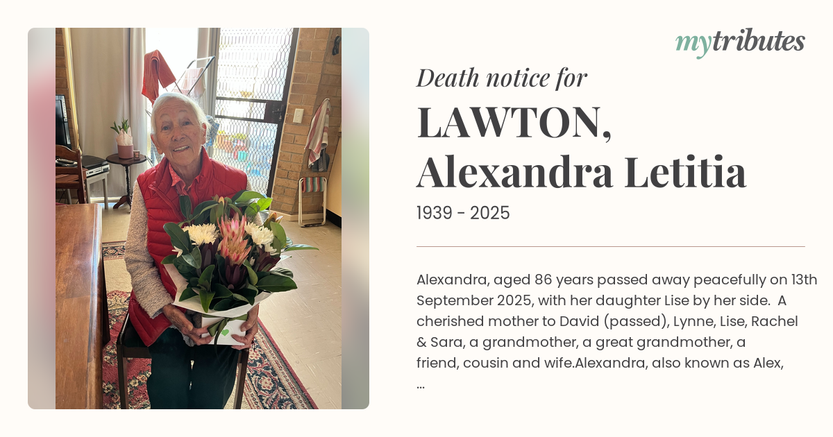 18°CAlexandra, aged 86 years passed away peacefully on 13th September 2025, with her daughter Lise by her side. A cherished mother to David (passed), Lynne, Lise, Rachel & Sara, a grandmother, a great grandmother, a friend, cousin and wife.