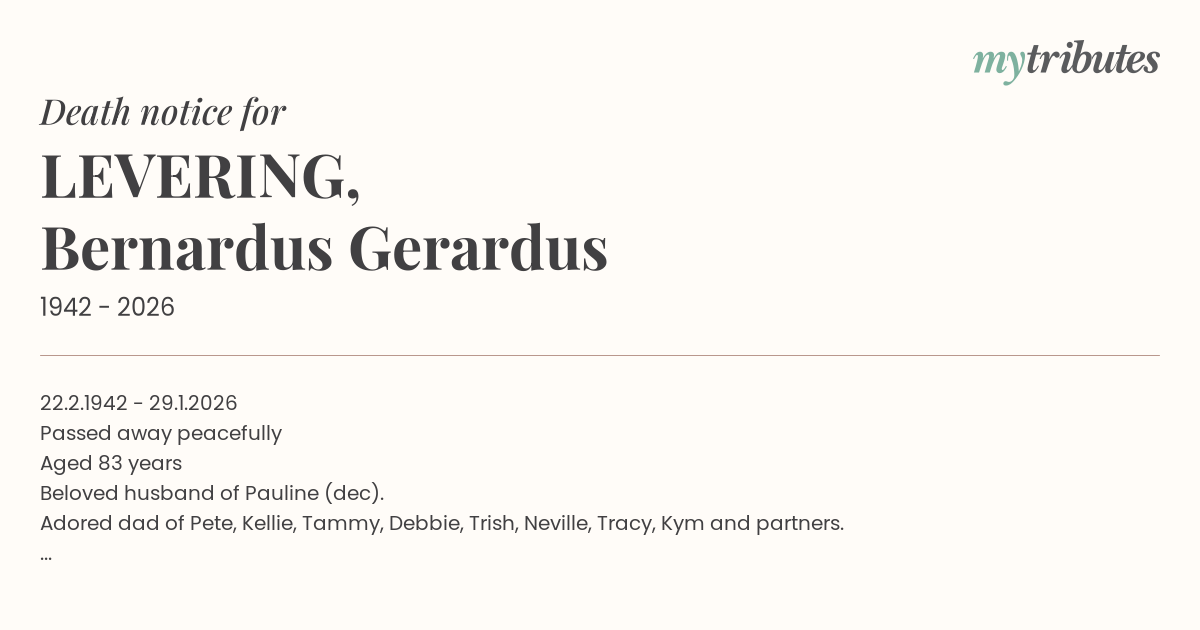 18°C22.2.1942 - 29.1.2026 Passed away peacefully Aged 83 years Beloved husband of Pauline (dec). Adored dad of Pete, Kellie, Tammy, Debbie, Trish, Neville, Tracy, Kym and partners. Treasured papa of 20 grandchildren and many great grandchildren. So Dearly Loved, So Sadly Missed.