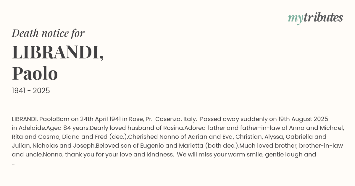 Paolo will be loved and remembered by his relatives and friends in Australia, Italy, Canada and France.