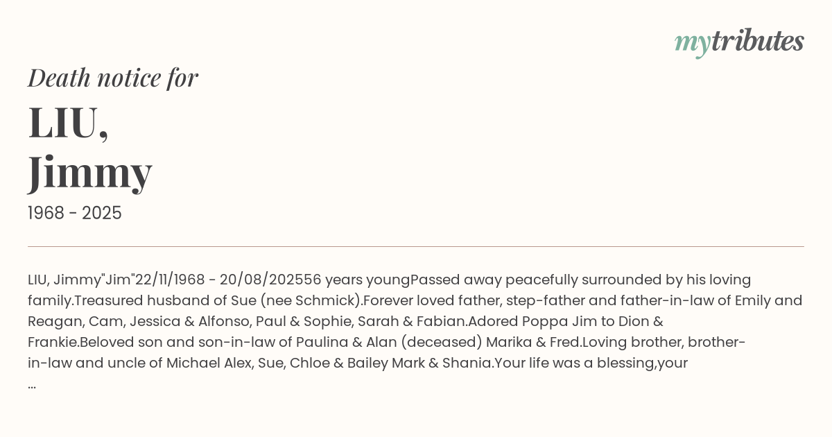 Loving brother, brother-in-law and uncle of Michael Alex, Sue, Chloe & Bailey Mark & Shania.