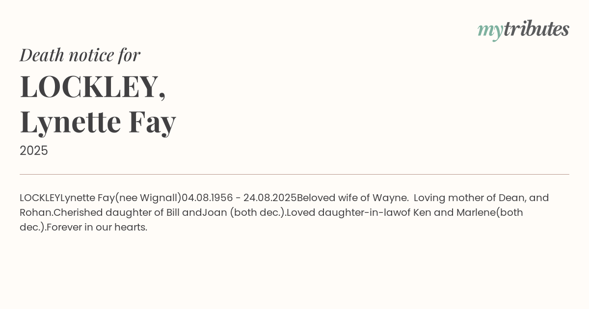 Beloved wife of Wayne. Loving mother of Dean, and Rohan. Cherished daughter of Bill and