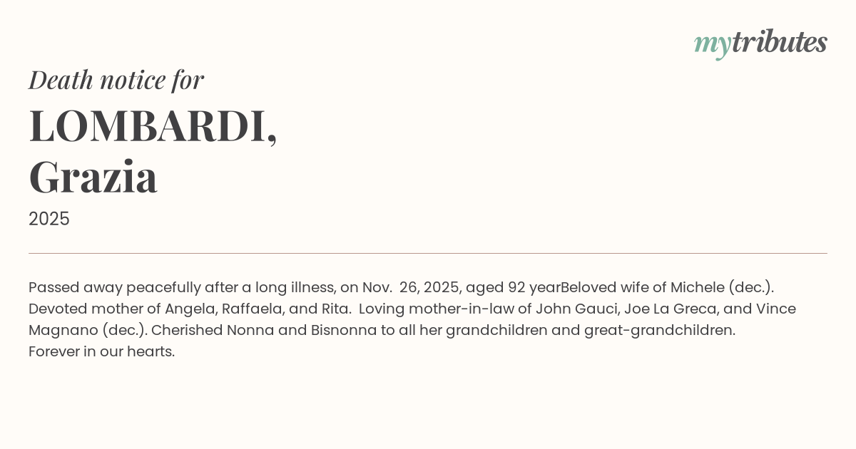 Beloved wife of Michele (dec.). Devoted mother of Angela, Raffaela, and Rita. Loving mother-in-law of John Gauci, Joe La Greca, and Vince Magnano (dec.). Cherished Nonna and Bisnonna to all her grandchildren and great-grandchildren.