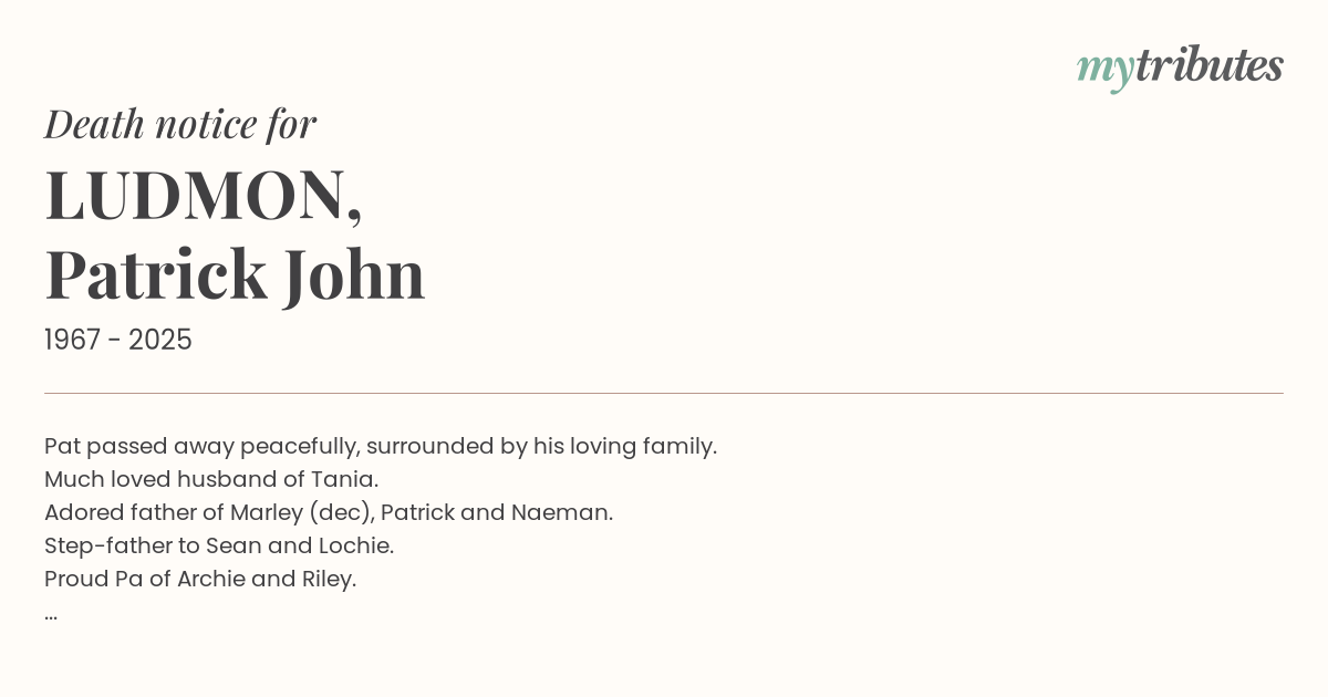 18°CPat passed away peacefully, surrounded by his loving family. Much loved husband of Tania. Adored father of Marley (dec), Patrick and Naeman. Step-father to Sean and Lochie. Proud Pa of Archie and Riley. Loved dearly by his extended family. It can't rain all the time.